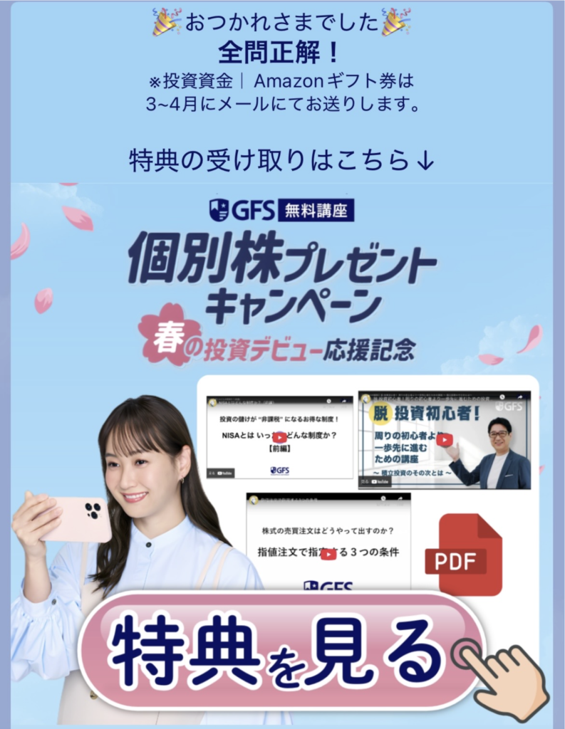 22日までの春の投資デビューキャンペーンでは、バフェッサ本編を最後まで視聴してクイズとアンケートに回答すると豪華6大得点がもらえるよ✨