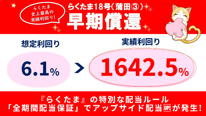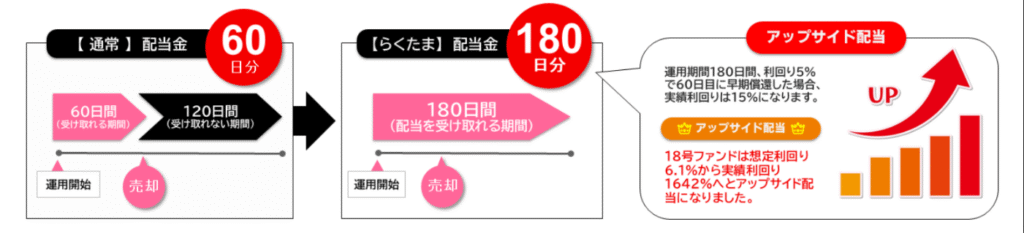でも、らくたまは「全期間配当保証」の仕組みにより、予定より早く償還されても、元々の運用期間分の配当を受け取れるよ。