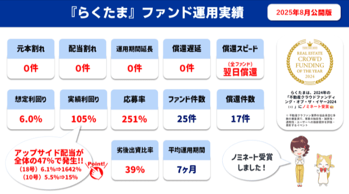 このように「らくたま」は実績を残すだけではなく、新しい制度を積極的に取り入れることで、投資家の不安を減らしてくれているよ😊