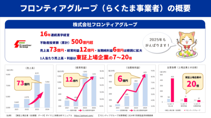 運営元である株式会社フロンティアグループは、不動産事業を中心として創業から安定した業績を残しているよ。