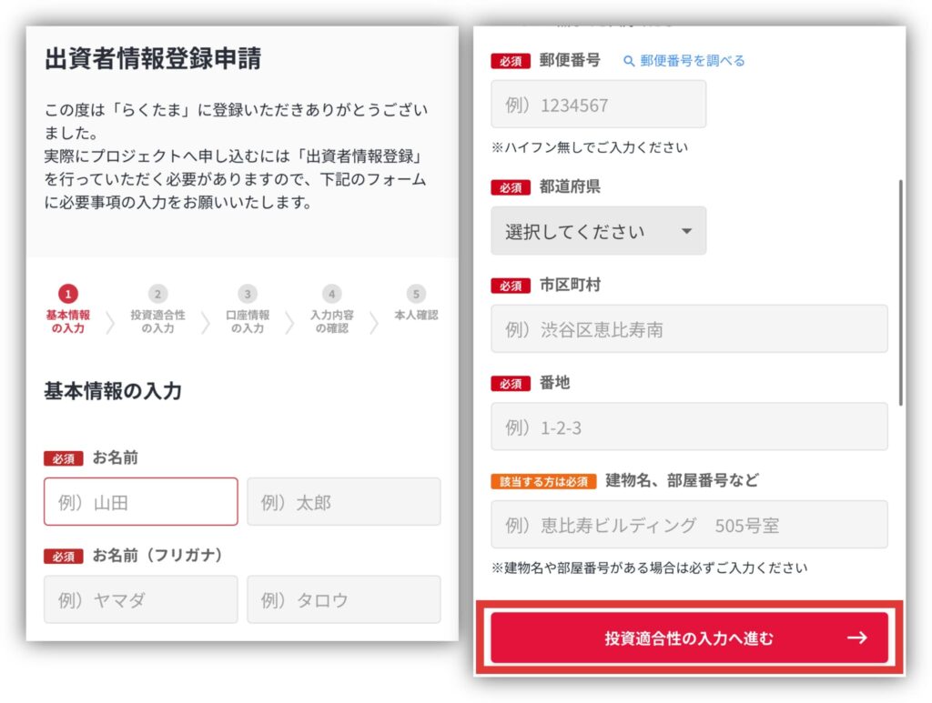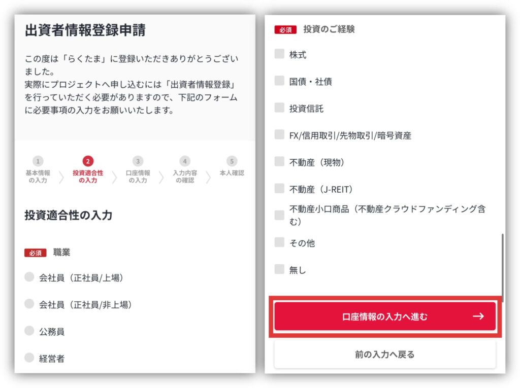 氏名や住所などの必要事項を入力したら「投資適合性の入力へ進む」をタップ。